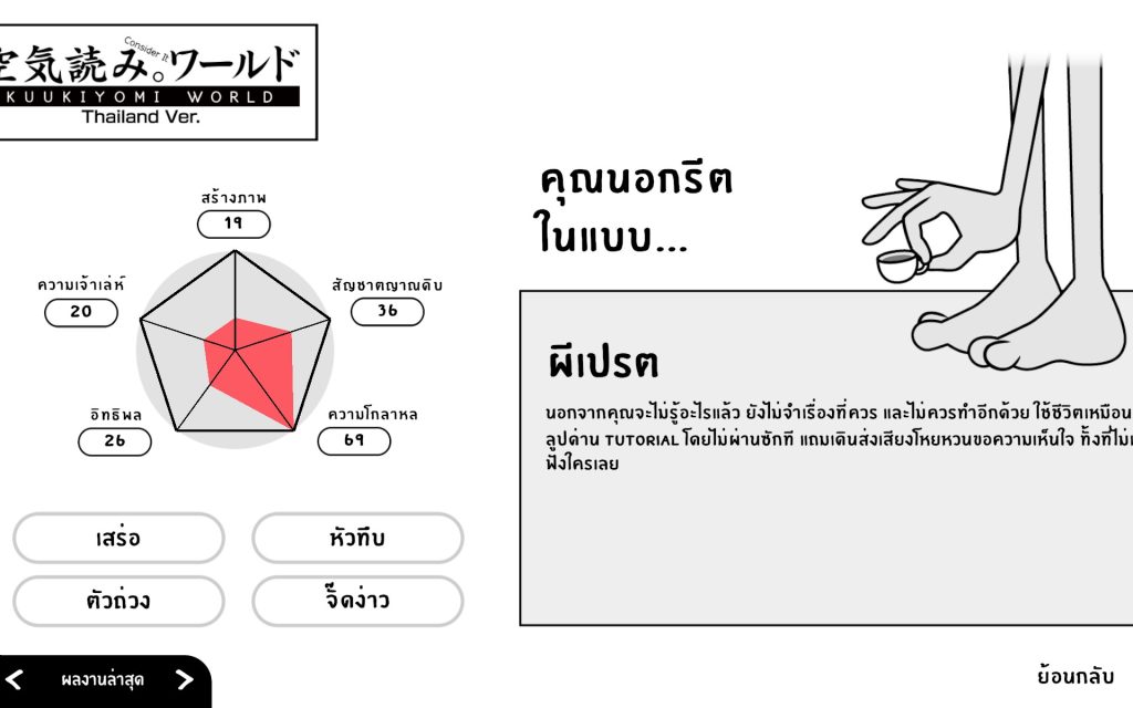 เมื่อเราเล่นครบตามเงื่อนไขและผ่านด่านทั้งหมดแล้ว เกมจะสรุปแนวโน้มพฤติกรรมของเราออกมาในรูปแบบขำ ๆ