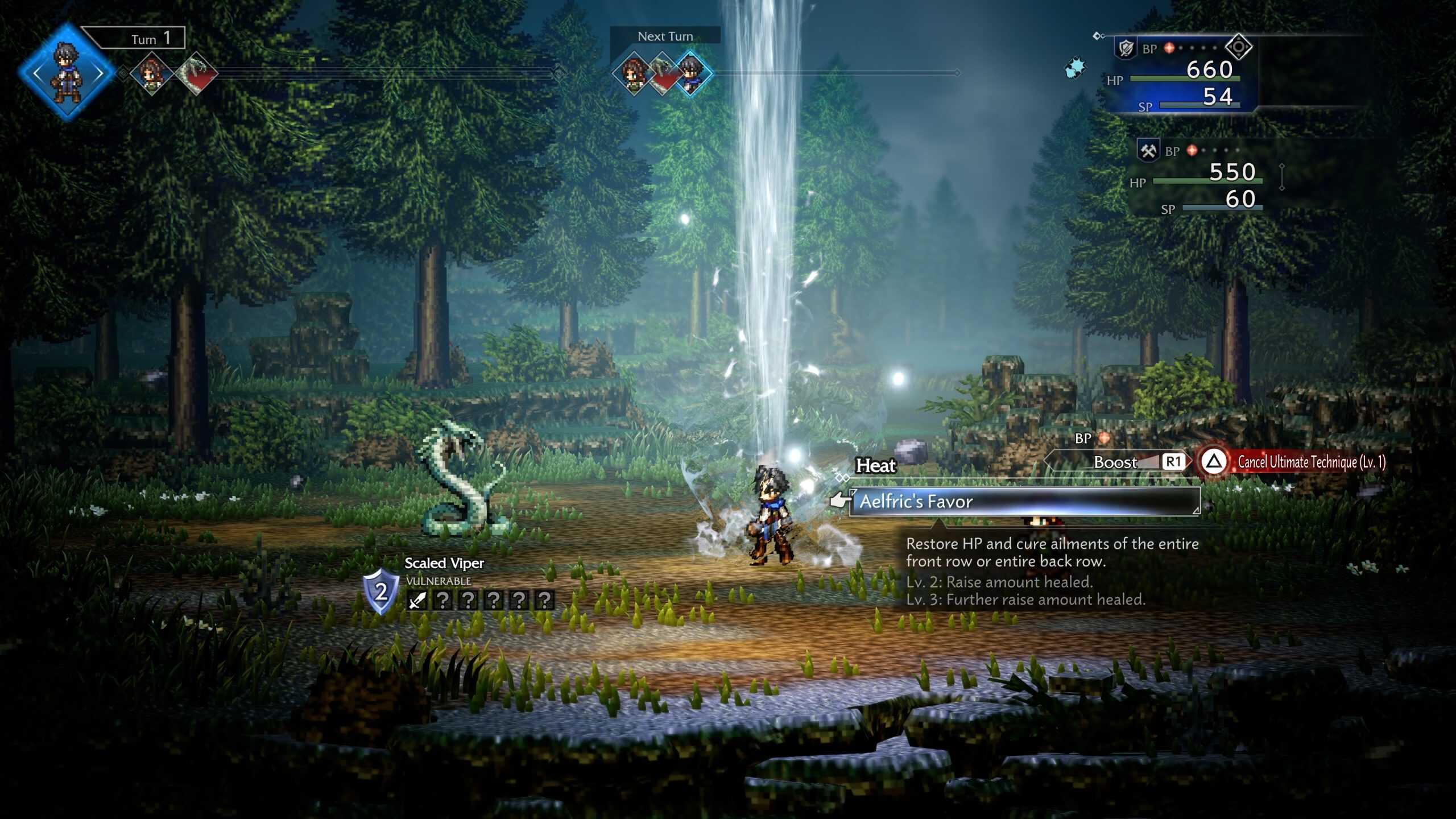ในเรื่องของการต่อสู้ ยังมีระบบ Break และ Boost ด้วย ซึ่งอันนี้ เป็นจุดเด่นที่มีมาในเกม Octopath Traveler ทุกภาคอยู่แล้ว