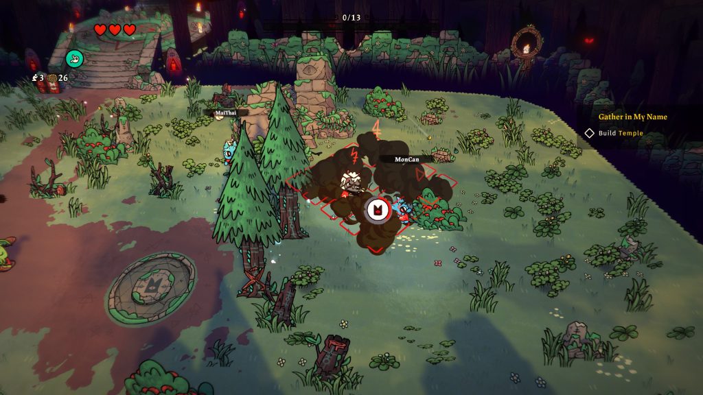 เกมเพลย์การเล่นในส่วนของความเป็นเกม Action RPG ก็จะเหมือนกันกับเกมอื่น ๆ นั่นคือเราจะได้บุกลุยไปตามเส้นทาง กำจัดศัตรู เลือกเส้นทางข้างหน้าว่าจะรับไอเทมอะไร จะเป็นสมาชิกลัทธิคนใหม่ หรือจะเป็นทรัพยากร ไม้ หิน อาหาร เพื่อกลับไปปรับปรุงลัทธิของเราให้ดีมากยิ่งขึ้นก็เลือกเอาที่ชอบ ส่วนอาวุธ สกิล พลังต่าง ๆ จะขึ้นอยู่กับเส้นทางลัทธิของเราด้วย ดังนั้นเกมนี้ไม่ใช่แค่การมุ่งหน้าเข้าป่า จัดการคนนอกรีต แต่คุณต้องวางแผนและเตรียมการลัทธิของคุณให้ดีพอด้วยอีกต่างหาก