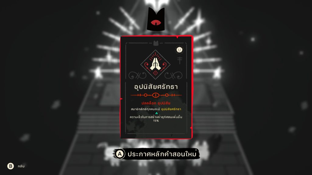 ต่อมาคือสิ่งของที่ทำให้ชาวลัทธิอยู่ได้สบายขึ้น ตั้งแต่หม้อปรุงอาหาร ที่นอน และสิ่งของอำนวยความสะดวกอื่น ๆ การจะรับสมาชิกใหม่เข้าลัทธิมานั้น เราต้องมีที่นอนให้เพียงพอด้วย และสามารถมอบหมายงานต่าง ๆ ได้ เช่นให้คนนี้ไปตัดไม้ คนนี้ไปทุบหิน คนนี้คอยสวดอธิษฐานเพื่อเก็บค่าศรัทธามาอัปเกรดบ้าน และสกิลของเราเอง และทุก ๆ วัน เราสามารถแสดงหลักคำสอนได้ 1 ครั้ง จะเป็นการเรียกสมาชิกลัทธิทั้งหมดมารวมตัวกัน และเทศนาให้เชื่อฟัง เราจะเก็บแต้มพิเศษมาอัปเกรดได้นั่นเอง