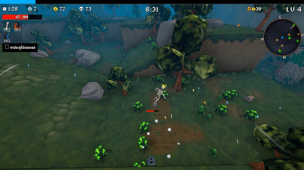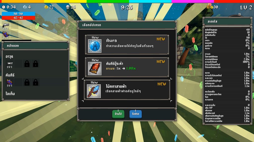 หลัก ๆ แล้ว ในการเล่น 1 รอบ เราสามารถติดตั้งอาวุธเพิ่มได้ก็จริง แต่จะได้แค่ชิ้นเดียวเท่านั้น หากอยากใส่เพิ่มก็ต้องปลดล็อคช่องด้วยการเล่นเพิ่ม สกุลเงินในเกมจะแบ่งออกเป็น Gold Coin ที่ได้ในระหว่างการเล่นในรอบนั้น Gold Coin จะใช้ในการเปิดหีบสมบัติเพื่อรับบัฟเพิ่มขึ้น แต่ยิ่งเปิดเยอะ ราคา Gold Coin ที่ต้องจ่ายก็จะแพงขึ้นเรื่อย ๆ นั่นเอง ส่วน Silver Coin นั้น จะได้หลังจากจบเกมการเล่นในแต่ละรอบ ระบบก็จะประมวลผลมาให้ว่าเราทำภารกิจอะไรสำเร็จไปบ้าง และจะให้รางวัลเป็น Silver Coin ซึ่งเจ้า Silver Coin นี่แหละ คือสกุลเงินสำคัญเพราะใช้ในการปลดล็อคตัวละคร อาวุธ สกิลใหม่ รวมไปถึงสกิล Passive ติดตัวที่ทำให้เราเล่นได้สบายขึ้น นั่นคือยิ่งเล่นยิ่งเก่ง