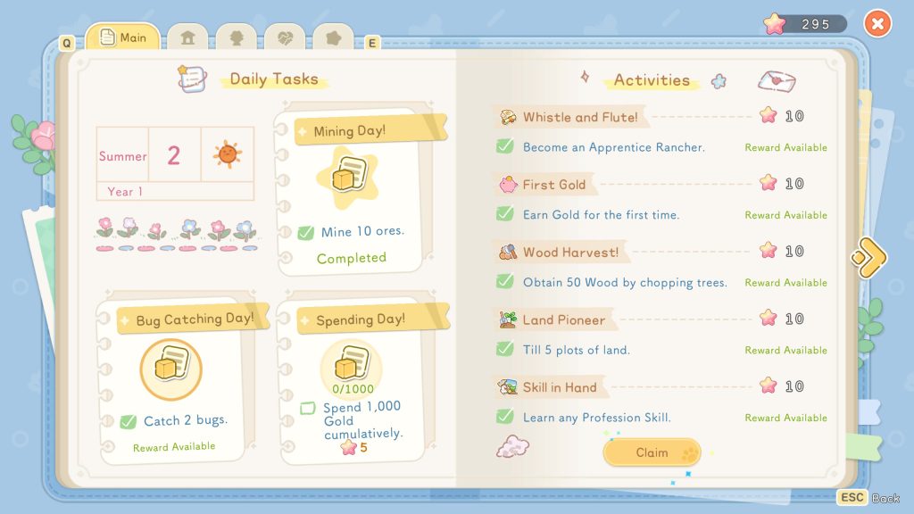 แต่ระบบสายอาชีพนี้จะเกี่ยวโยงกับระบบภารกิจประจำวันหรือ Daily Tasks ในเกมด้วย สำหรับภารกิจประจำวันในเกมนี้ จะเป็นภารกิจแบบสุ่มในทุกวัน เช่น ขุดแร่ 10 ก้อน จับแมลง 2 ตัว ขายของให้ได้เงิน 1,000 อะไรประมาณนี้ นอกจากนั้นก็จะมีระบบ Activities ที่เป็นภารกิจระยะยาว และการสำรวจต่าง ๆ ซึ่งทุกอย่างที่เราทำ เราจะได้ไอเทมที่ดาวสีชมพูที่เรียกว่า Star Node