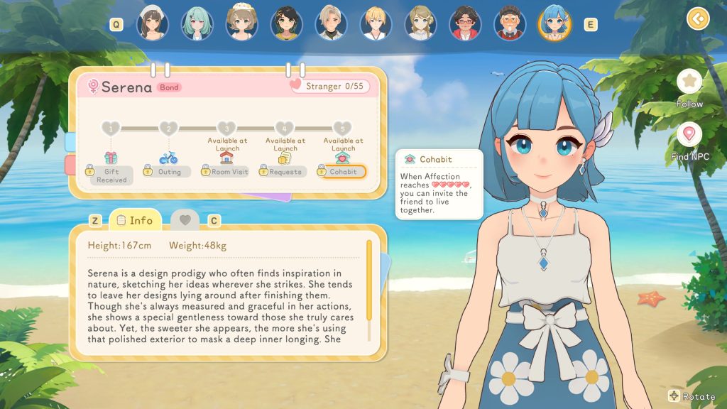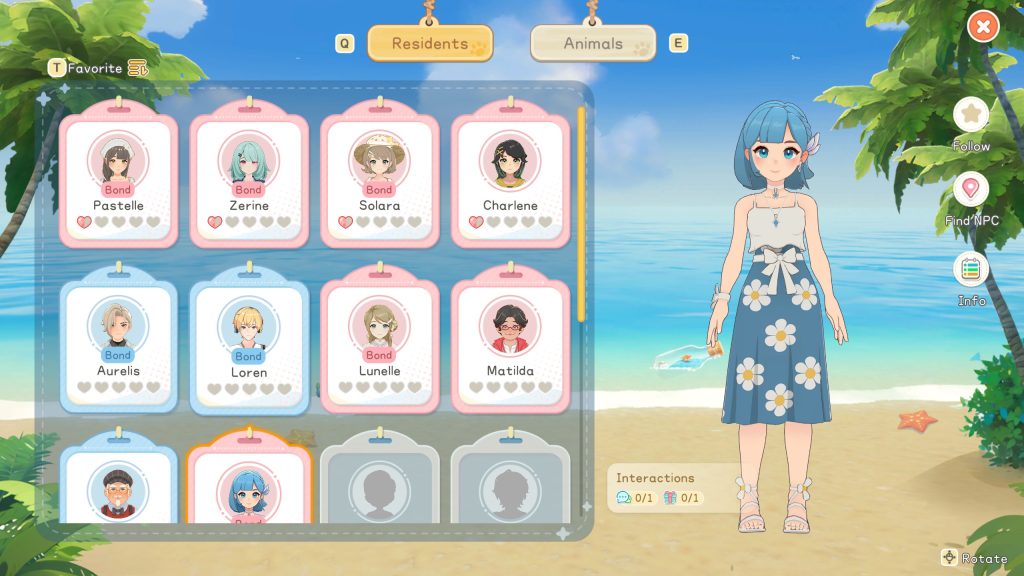 อย่างแรกคือ เราจะต้องไปคุยเพื่อทำความรู้จักกับเหล่า NPC ในเกมก่อน ซึ่งตัวละครไหนที่เราสามารถจีบได้ ในหน้าเมนูจะขึ้นว่า Bond และเกมจะแบ่งความสัมพันธ์ออกเป็น 5 ขั้น ตั้งแต่คนแปลกหน้า จนไปถึงไปเที่ยวด้วยกัน ไปเยี่ยมบ้านกัน ทำคำขอให้อีกฝ่าย ไปจนถึงแต่งงานและย้ายเข้ามาอยู่ร่วมกัน และในขณะที่เกมอื่นนั้น เราต้องขนของจำนวนมาก ไปมอบให้ NPC แบบสุ่ม เพื่อดูว่าตัวละครชอบไม่ชอบอะไร แต่ในเกมนี้ ขอเพียงเราตั้งใจอ่าน และกดคุยกับ NPC ก็จะมีคำใบ้ และเดาได้ว่าตัวละครชอบอะไร